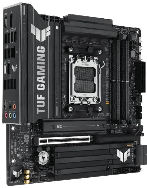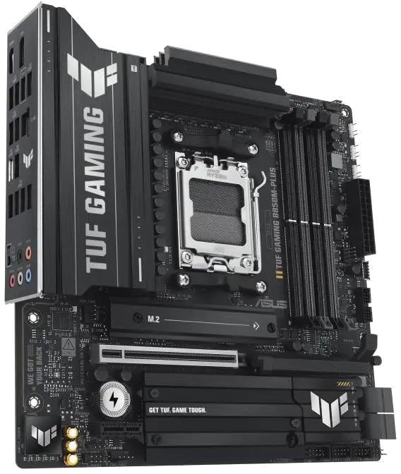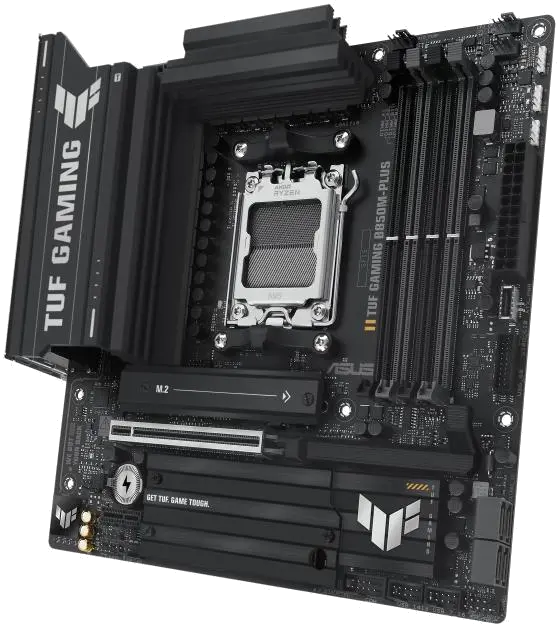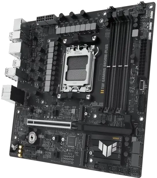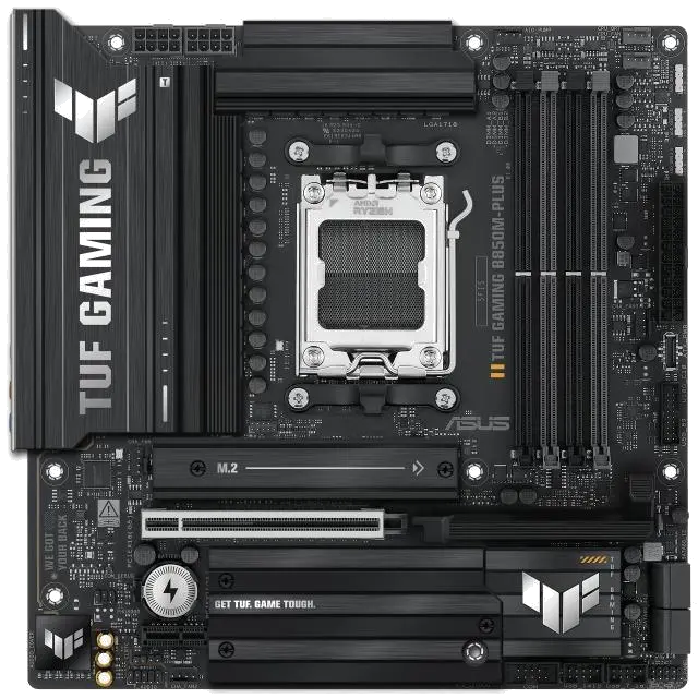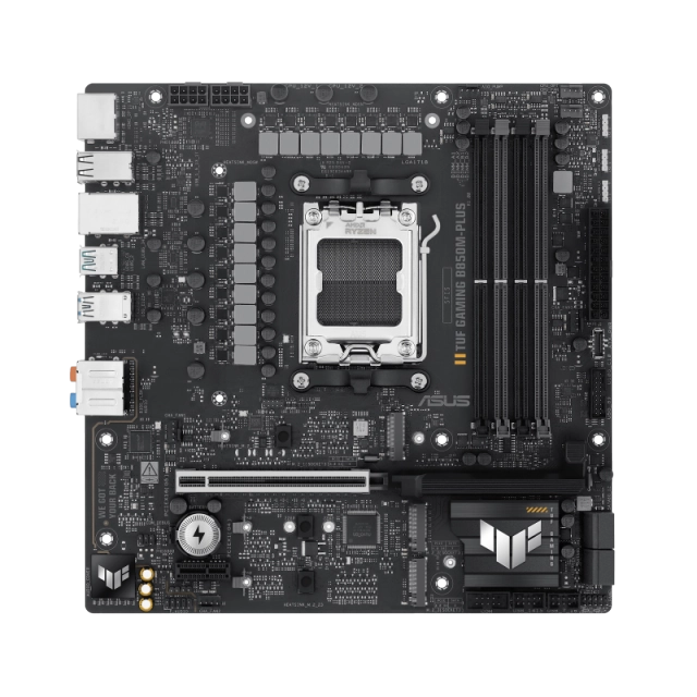 TUF GAMING B850M-PLUS Asus motherboard for AM5 socket, with 4 DDR5 slots, DisplayPort and HDMI outputs, PCIe 5.0 x16 slot for video card, PCIe 4.0 x16 and PCIe 4.0 x1 slot, 3 M.2 slots and 4 SATA 6Gbps ports, in mATX format for advanced gaming and work systems.