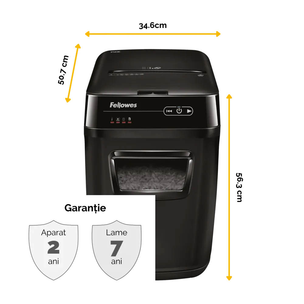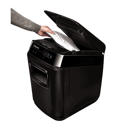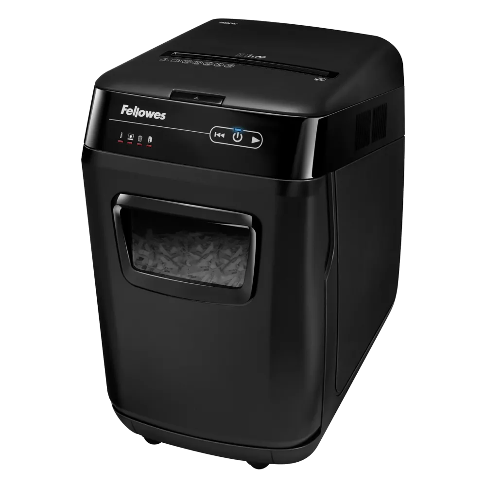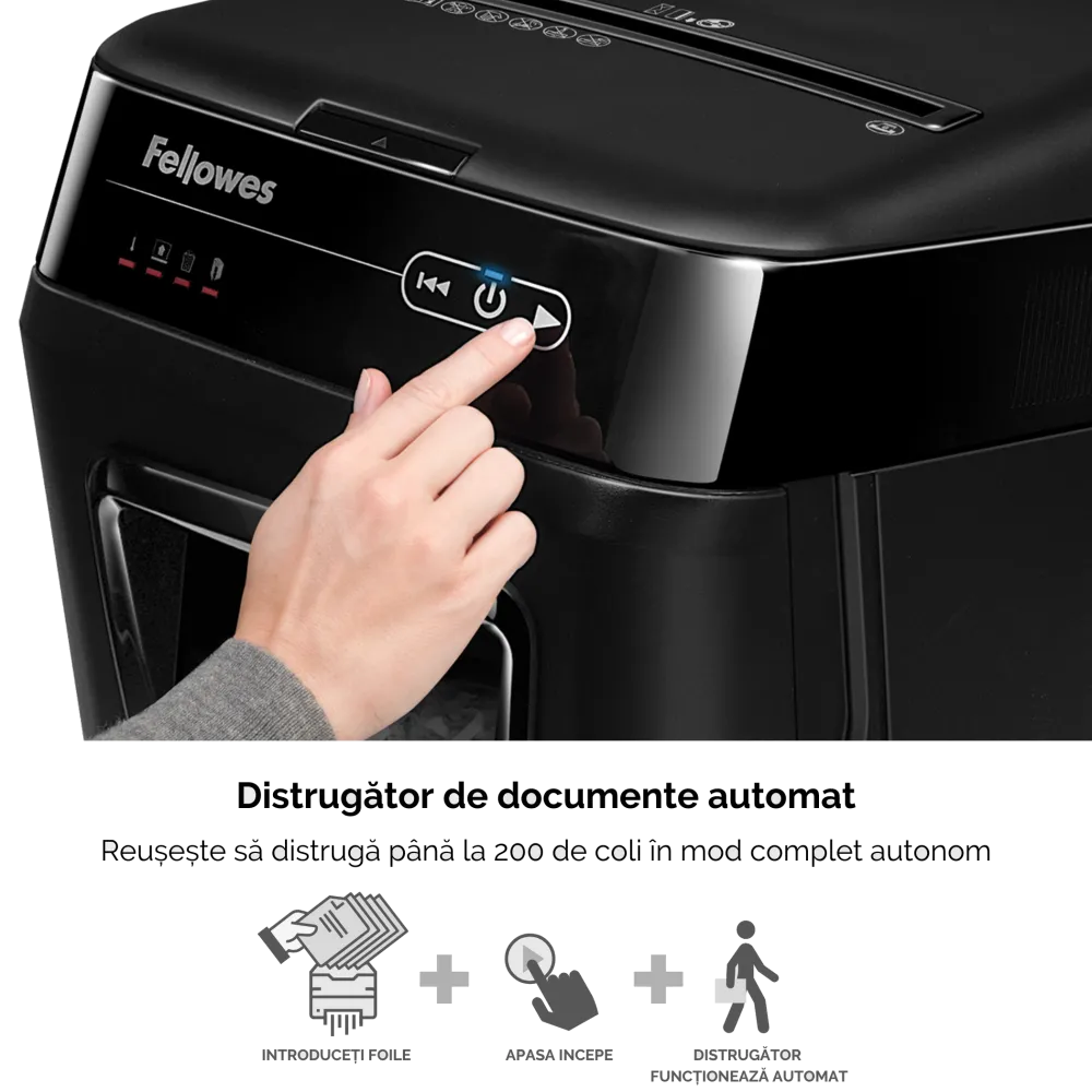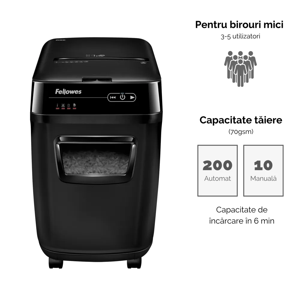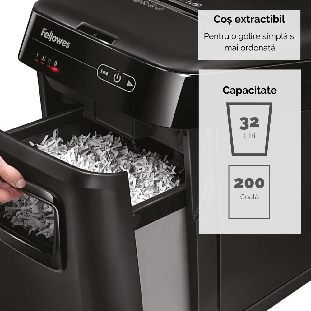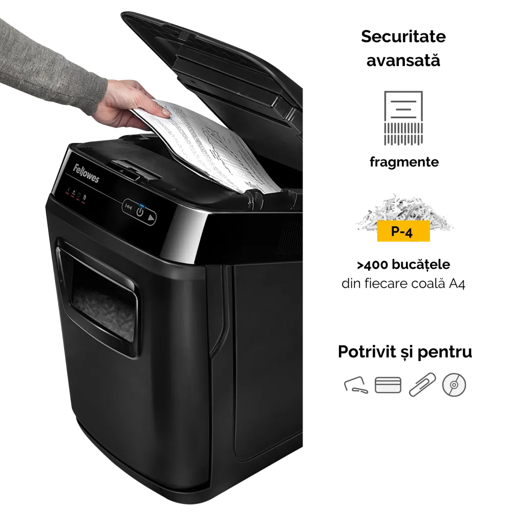 Distrugator documente AutoMax 200C cross cut cu taiere in particule 4x38mm nivel securitate P-4 ADF pana la 200 coli pentru alimentare automata fara supraveghere si alimentare manuala pana la 10 coli distruge capse agrafe carti de credit si medii optice CD si DVD tehnologia AutoReverse deblocheaza automat blocajele SilentShred asigura functionare silentioasa cos deseuri tip sertar 32l ciclu utilizare 25 minute pornit 25 minute oprit volum maxim recomandat 400 coli pe zi dimensiuni 563x346x507mm culoare neagra garantie 24 luni Fellowes 4653602-99