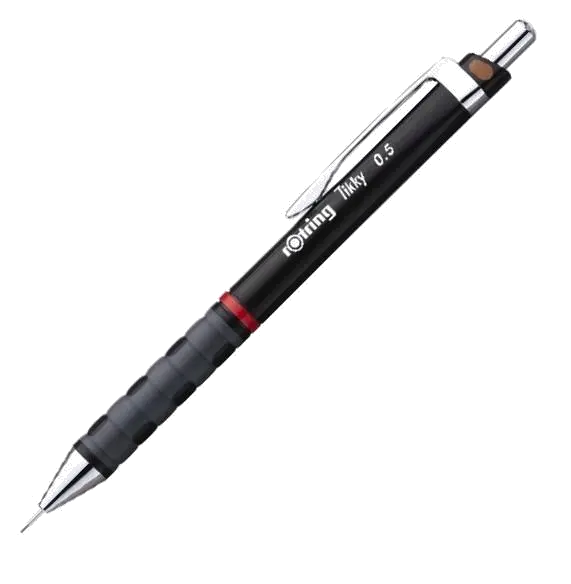 Creion mecanic 0.5mm TIKKY 3 cu corp plastic negru, radiera integrata, grip cauciucat si accesorii metalice cromate, marca Rotring.